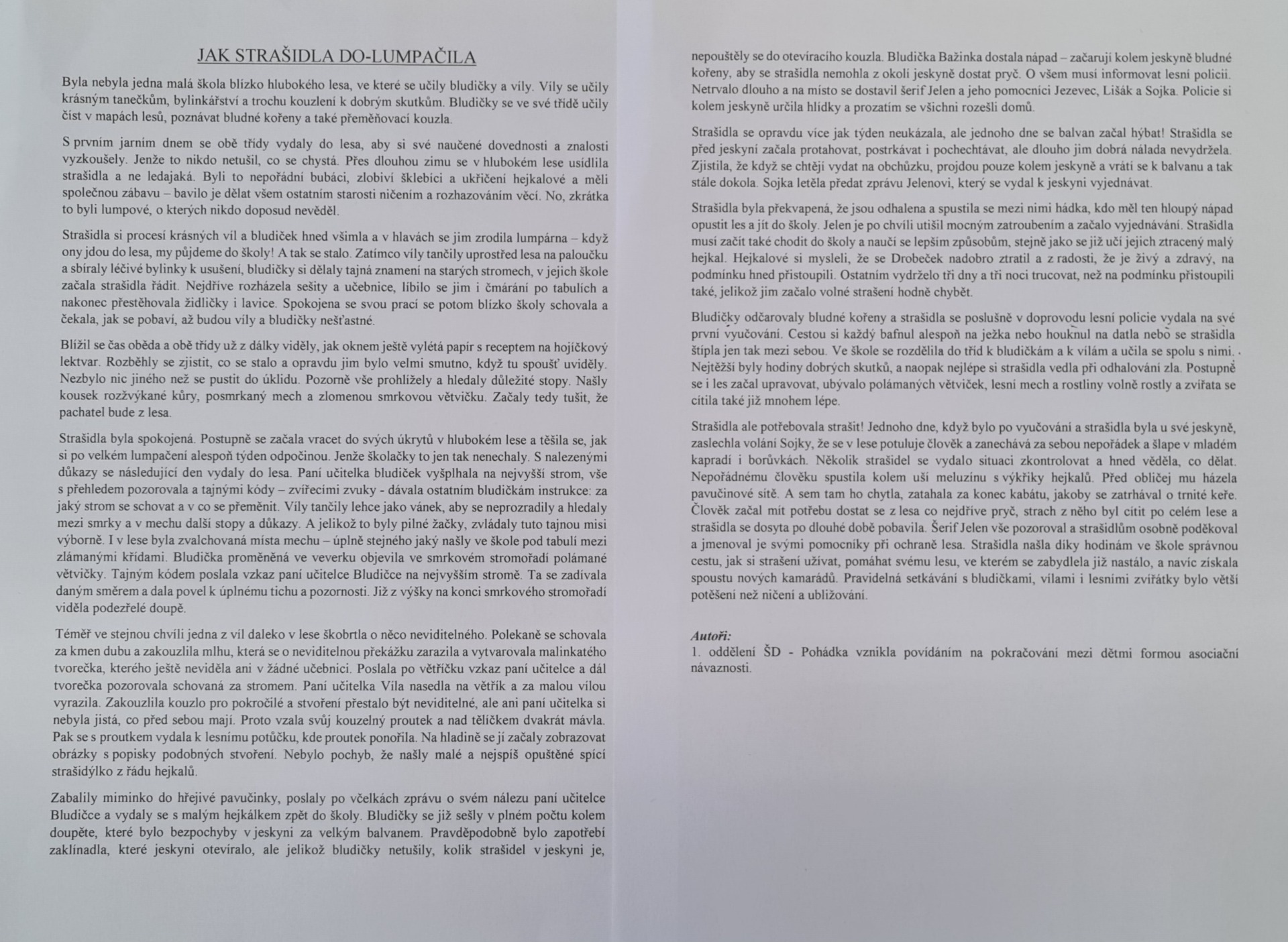 I. oddělení ŠD se zapojilo do literární soutěže vyhlášené městem Jičín - města pohádky. Zde si můžete přečíst náš příběh z hlubokého lesa "Jak strašidla do-lumpačila".