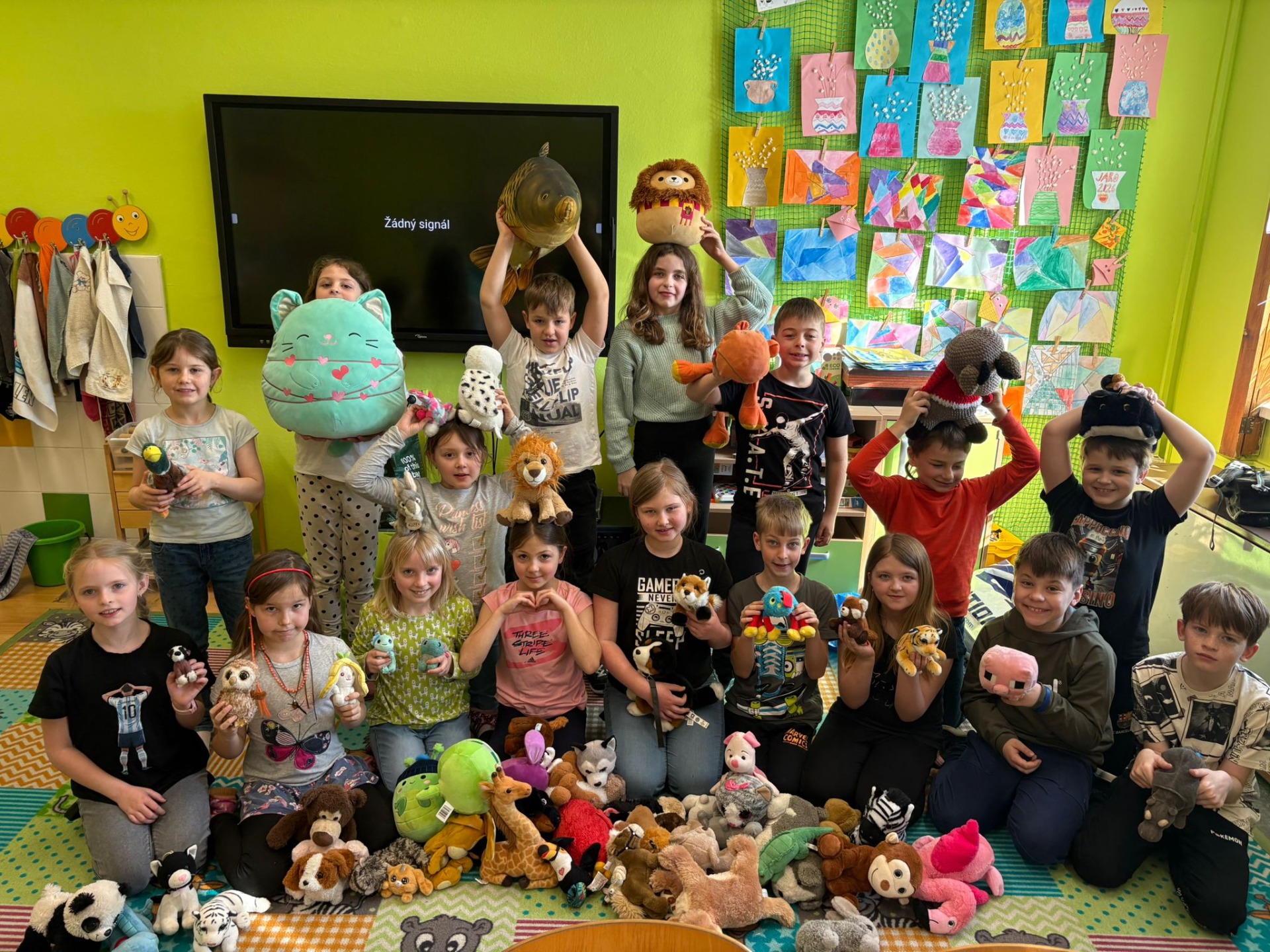 Při hodinách angličtiny se nám zaplnil koberec plyšáčky. Děti představovaly zvířata z okruhů: pets, farm animals and zoo animals.